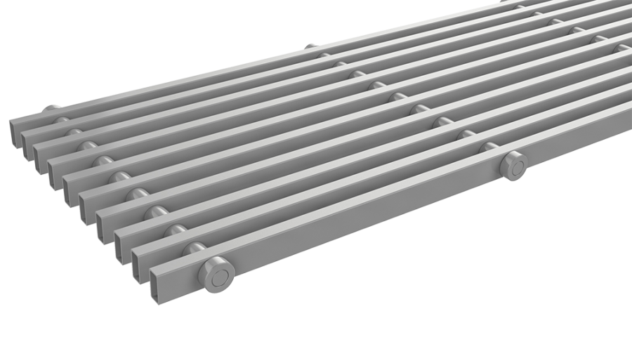 Floor grille length 100 cm, width 26 cm, steel model, RAL 9006 colour (grey) lacquered, roll-up, for single trench heater without alteration. Grille measurement, given in the order code, corresponds with the measurement of the respective trench heater. Nett dimension of the grille is available upon request.