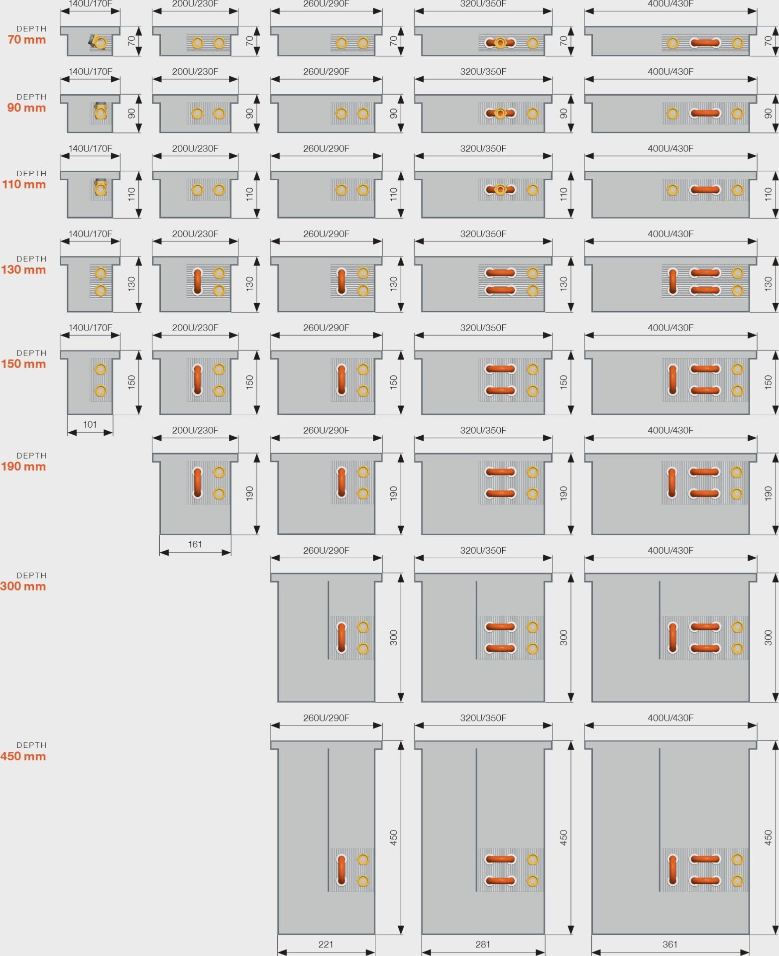 P* – single-stream heat exchangers are fitted as standard in trench heaters 140 mm wide, depth of 70, 90 and 110 mm only.