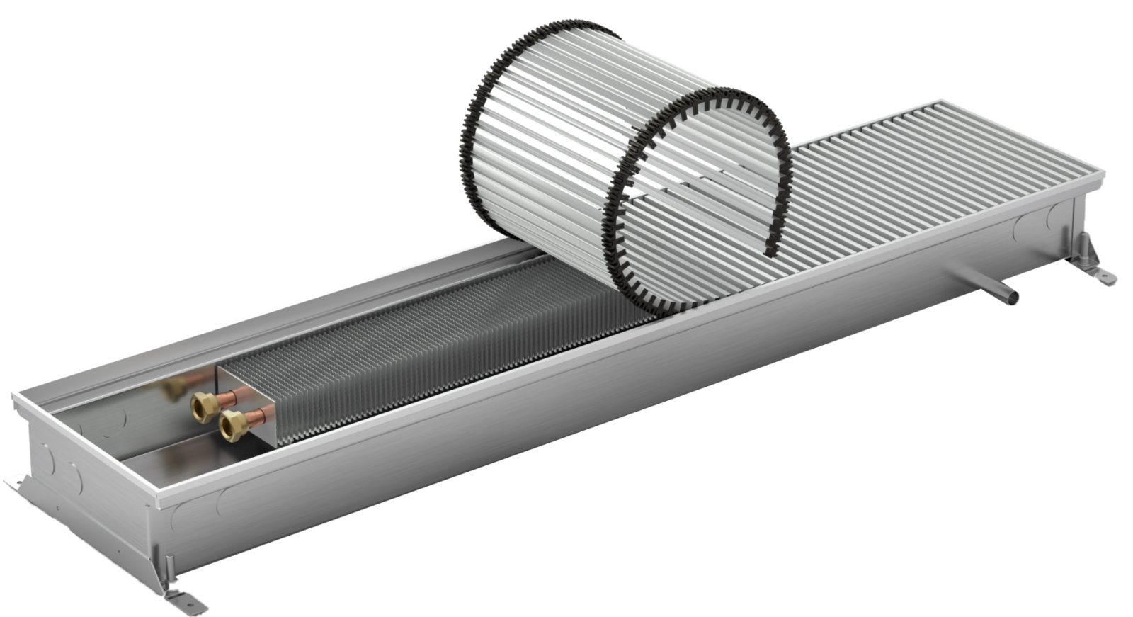 KORAFLEX trench heater with natural convection, Pool model, length 100cm, depth 11cm, width 26cm, counter-flow RAL 9006 grey lacquered heat exchanger, finished with hem, right-hand connection to heating system, without lowered face.