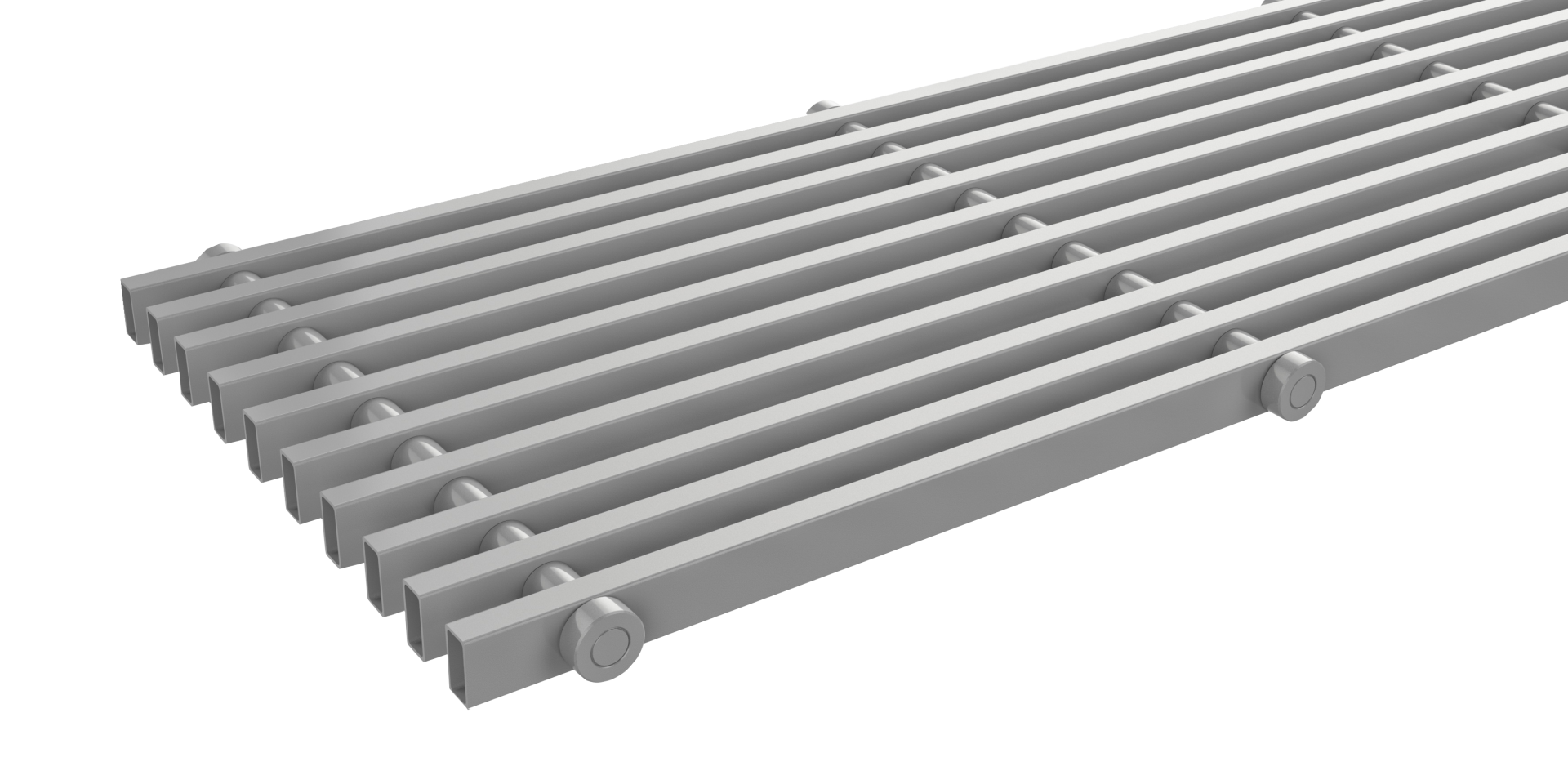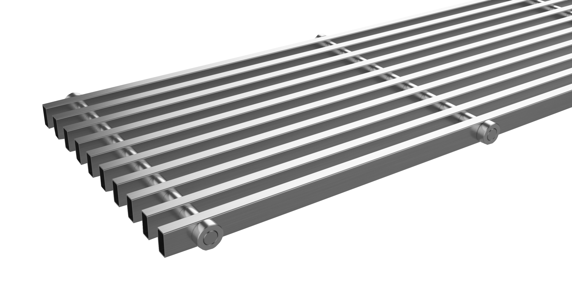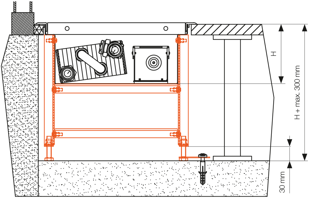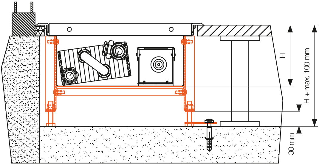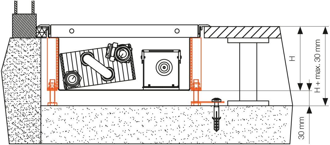 Trench heaters are fitted with reinforcing bars and set screws, which enable the trench heater to be installed at the required height. Set screws must be anchored to the floor to prevent movement. Reinforcing bars are not included as standard and cannot be fitted subsequently. The screws allow setting a maximum height which is max. 30 mm higher than the trench heater itself. Recommended for raised floors with a maximum depth 30 mm greater than the unit height of the trench heater.