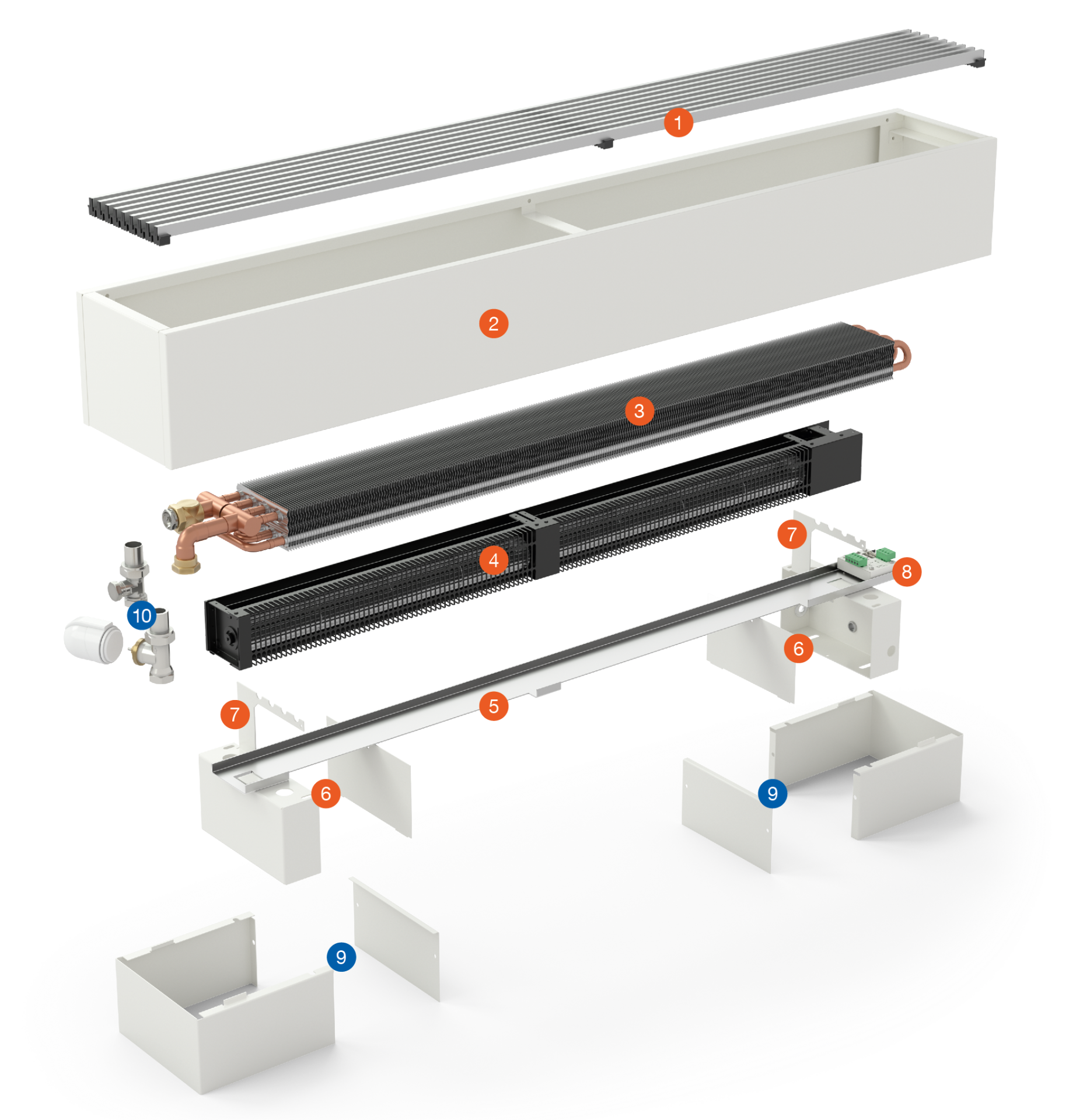KORALINE Optimal-V LVO free-standing convector with fan, Length 200 cm, Height 15 cm, Width 18 cm, Steel casing white RAL 9016, Aluminium silver elox grille, non-lacquered heat exchanger.