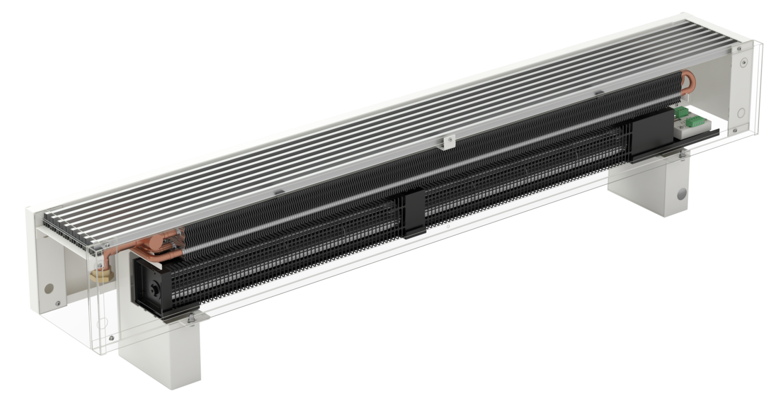 The KORALINE Optimal-V LVO height 150 mm, width 180 mm range of free-standing convectors is equipped with a specially designed Al/Cu heat exchanger and a set of low-energy, high-performance fans with minimal power consumption to ensure that the convectors achieve high efficiency even at low-temperature gradients. This type of convector is thus ideal for buildings with low-temperature systems such as heat pumps, solar systems, condensing boilers etc. The convectors can be controlled via BMS and due to their immediate response to changes in room temperature, very quiet operation and low surface temperature, they are suitable for use in family homes, apartment buildings and public areas.