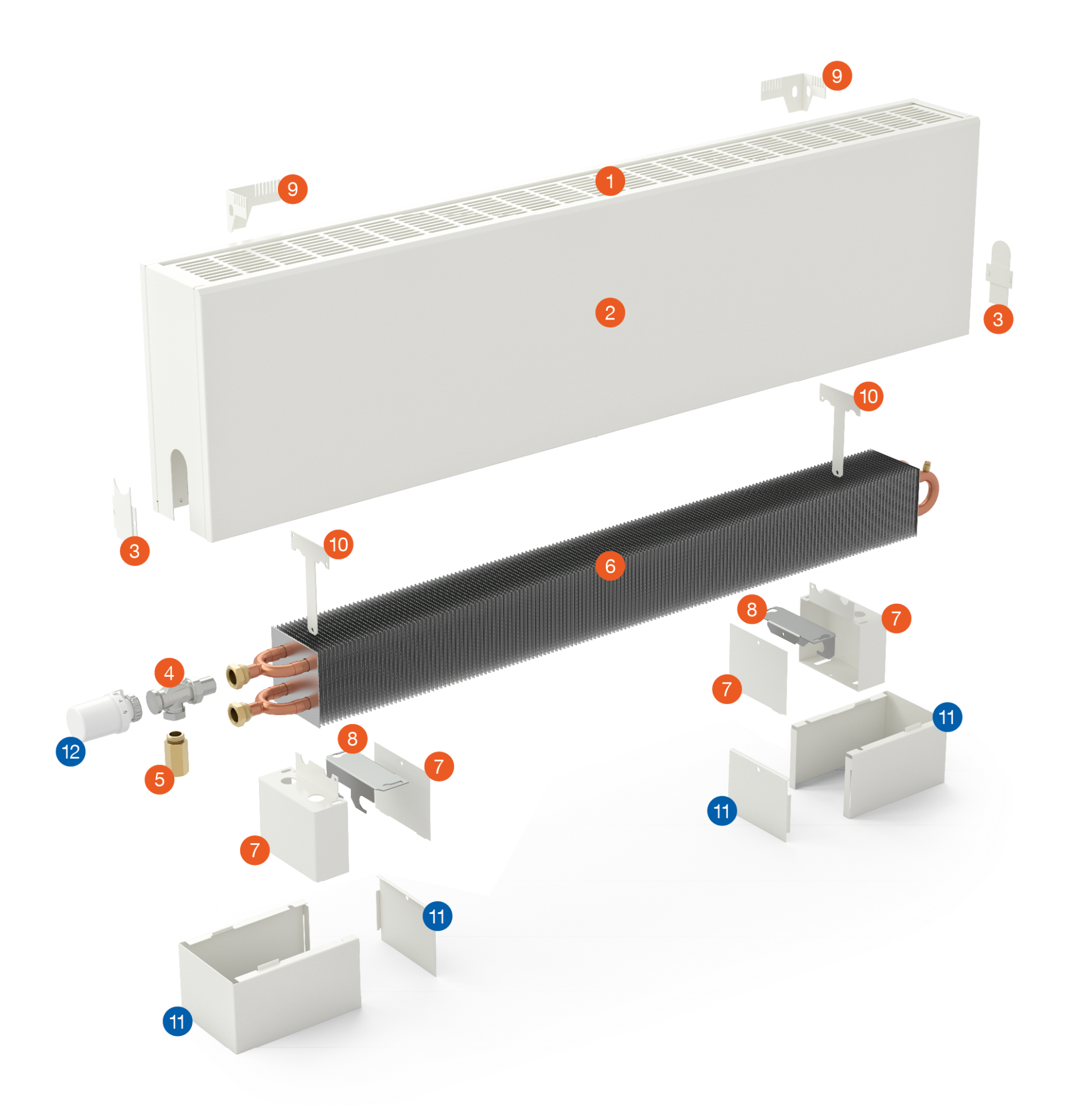 | KORALINE | Natural convection | Type Safe | | Length/Height/Width (cm) | | Convector connection | Heat exchanger colour | Material used | Grille type | Grille colour | | Casing colour |