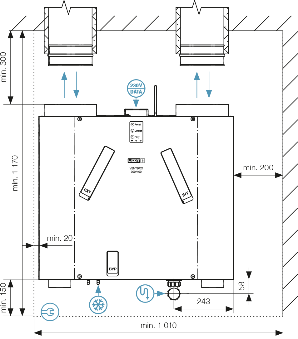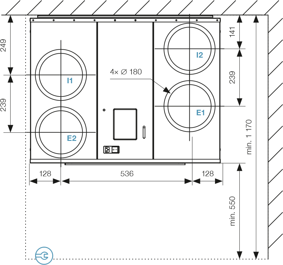 | Electrical input (without preheating) | 135 W/400 m³/h; 65 W/280 m³/h; 18 W/80 m³/h | |