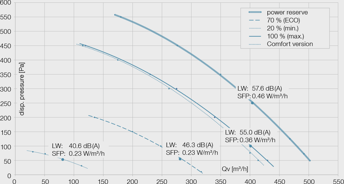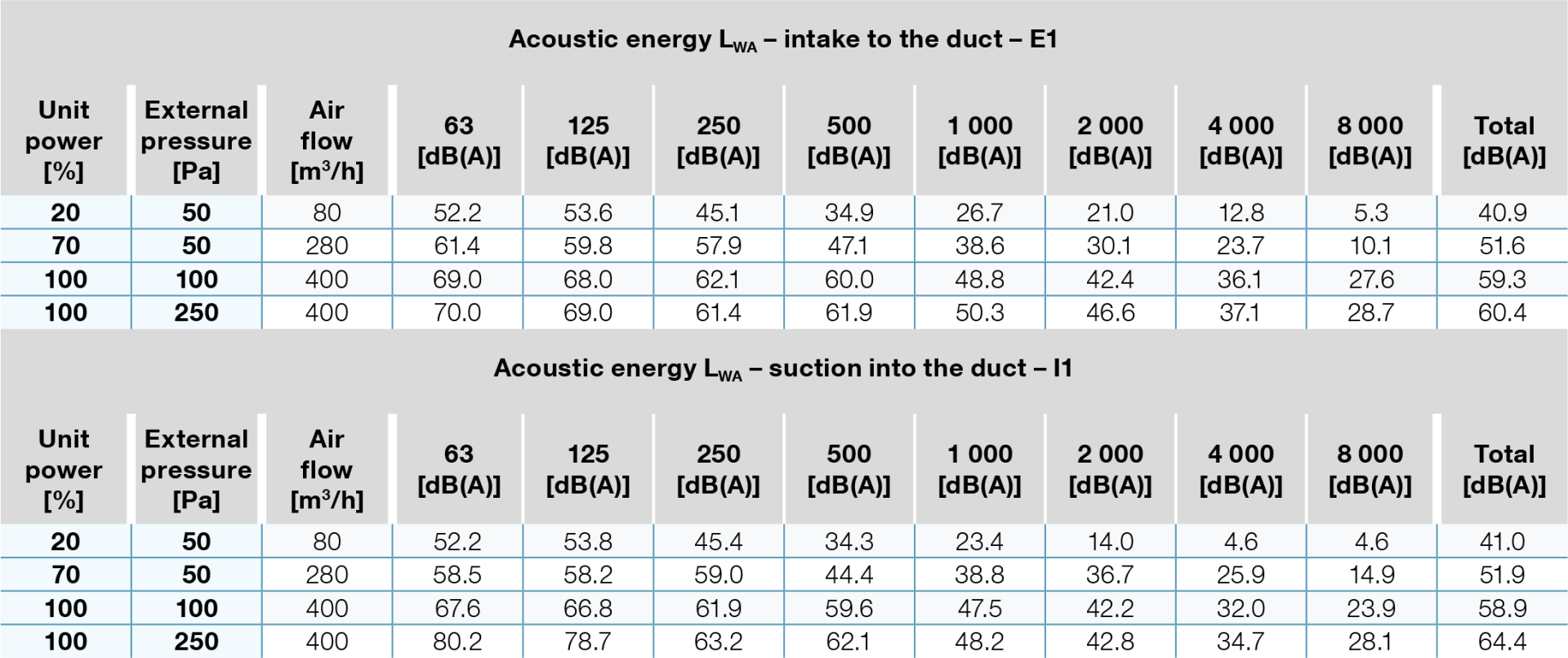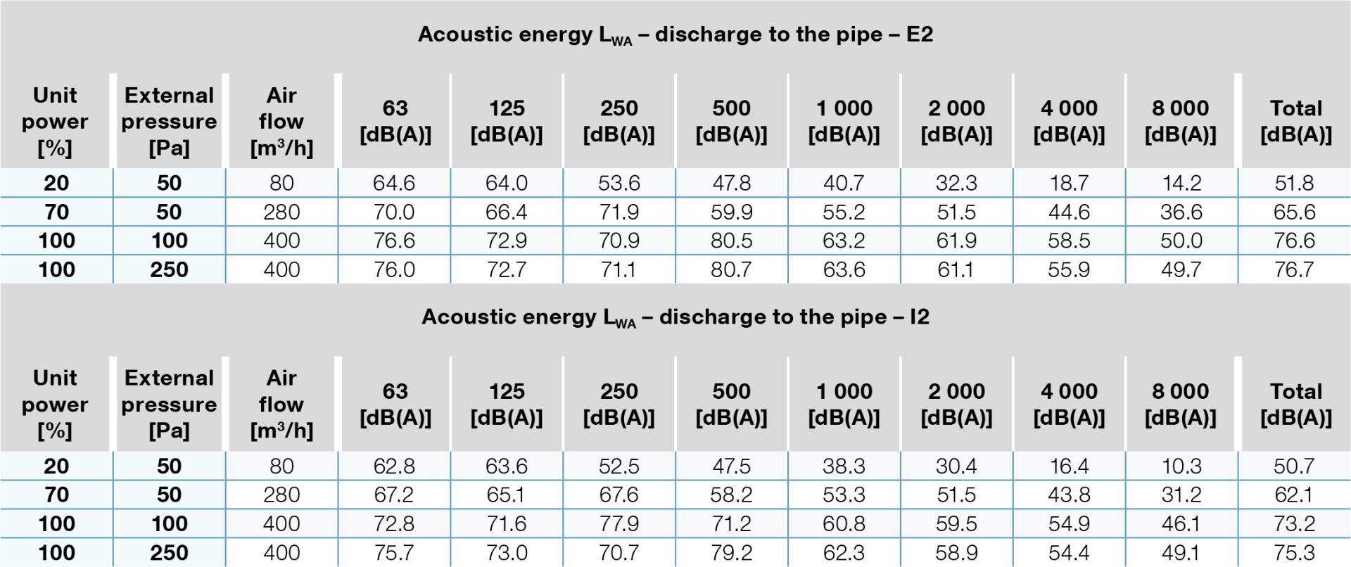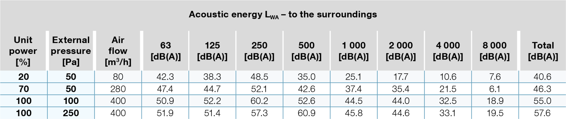 | Acoustic energy LWA [m³/h/Pa/dB] | 280 m³/h/50 Pa/46.3 dB | |