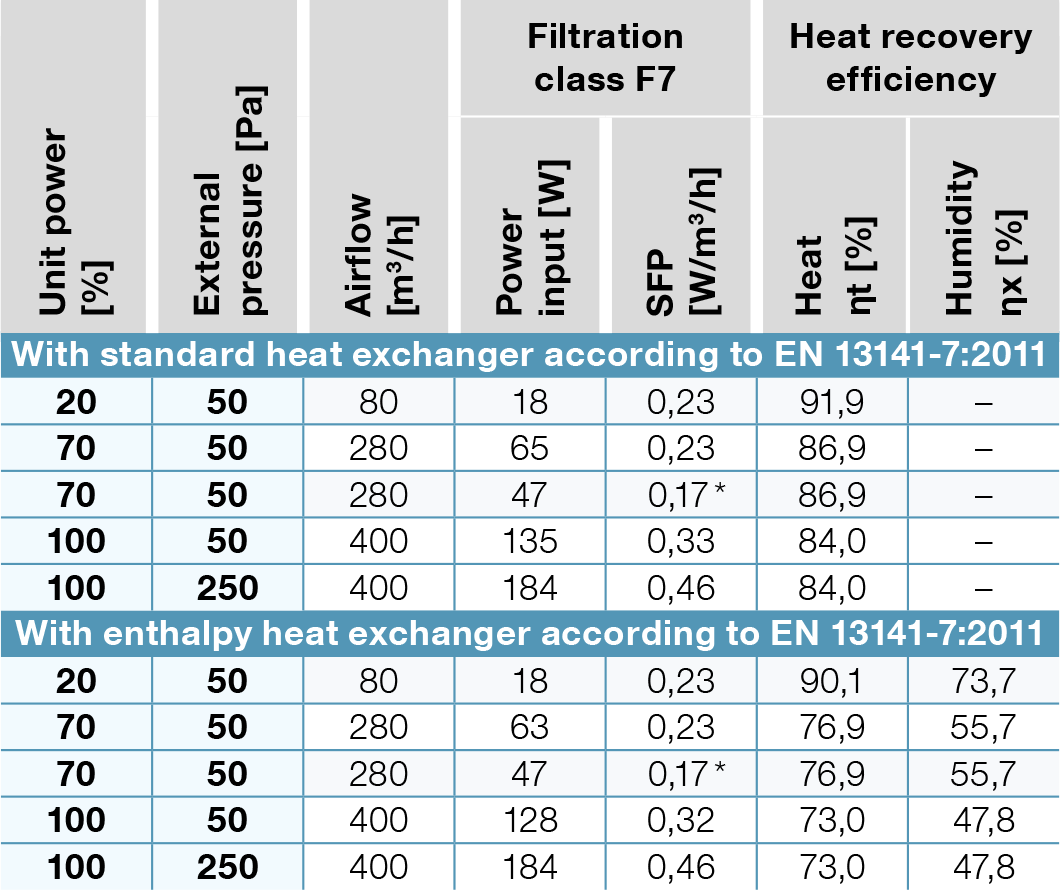 | Filters supply//exhaust (% of particles captured in a given filter class) Premium version and Comfort version | F7 pollen/odour ePM1 70 % (F7 odour optional) | F7 pollen ePM1 70 % |