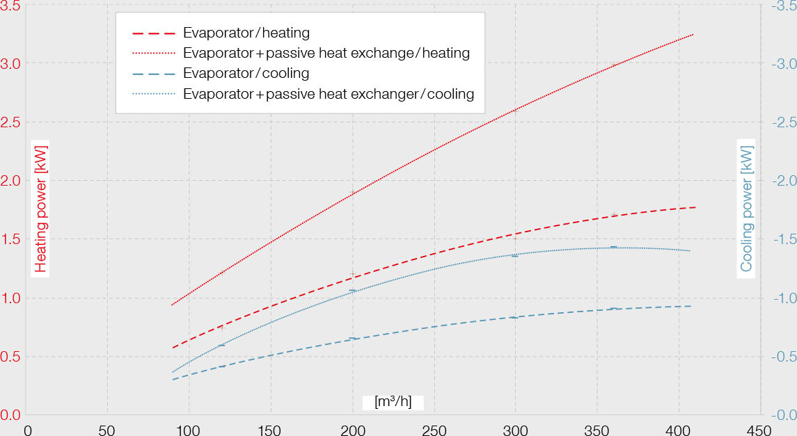 The unit with the highest possible configuration is also equipped with a direct evaporator on the supply air side, which is connected to the outdoor compressor unit. This assembly thus forms a unique ventilation system with heat recovery, with the option of setting the desired target indoor air temperature including automatic humidity adjustment of the living space according to the current outdoor conditions. The required parameters can be conveniently set in the control menu. In the winter, the system allows the supply air to be heated, while in the summer it is possible to cool the supply air and dehumidify it at the same time. These features contribute significantly to improving the indoor comfort of living spaces. The system is suitable for low-energy and passive houses, where it supplements or partially replaces the basic heating system – especially in the transitional period such as autumn or spring, when the outside temperatures are still low.